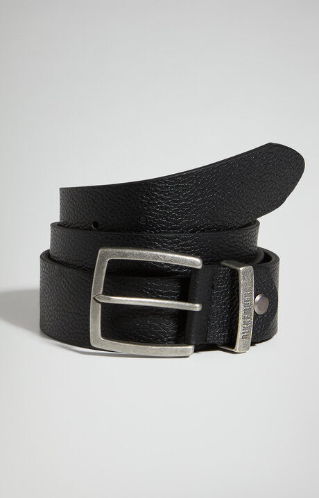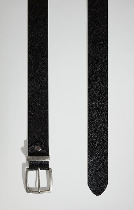 Cinto masculino em pele, granulado de alta qualidade com fivela em metal prateado envelhecido. Ponta arredondada, logotipo gravado. Largura: 38 mm.